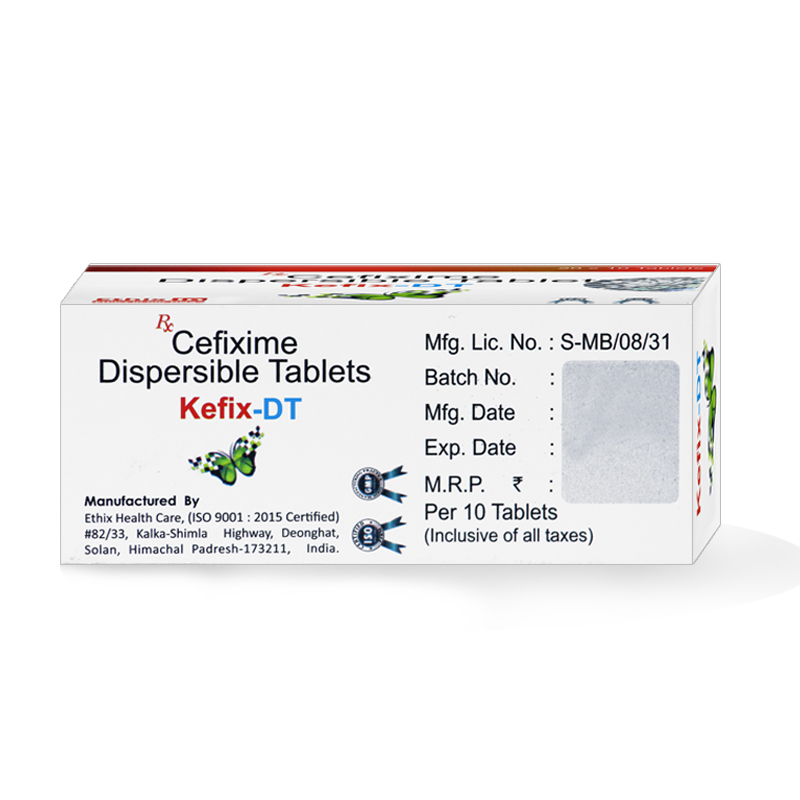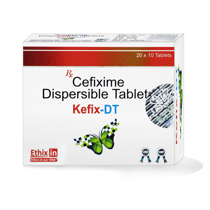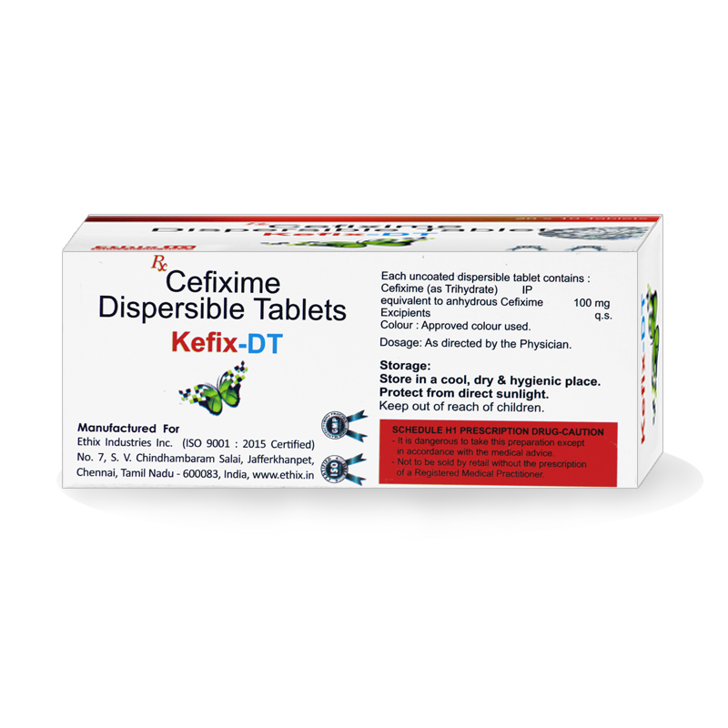 KeFix 100 DT (Dispersible Tablet) contains Cefixime, a third-generation cephalosporin antibiotic that is effective in treating a wide range of bacterial infections. It works by inhibiting bacterial cell wall synthesis, ultimately killing the bacteria and stopping the infection.