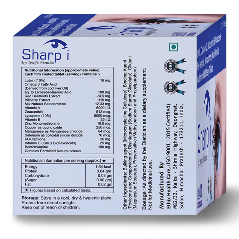 Sharp i [Cap] is a unique nutritional supplement formulated to support eye health and promote visual clarity. Combining Lutein and Zeaxanthin, two powerful antioxidants known for their protective effects on the eyes, with the nutritional benefits of Red Beetroot Extract and Multivitamins, this supplement is designed to maintain and improve your overall vision health. It provides essential nutrients that help protect against oxidative stress, support macular health, and prevent age-related vision problems.